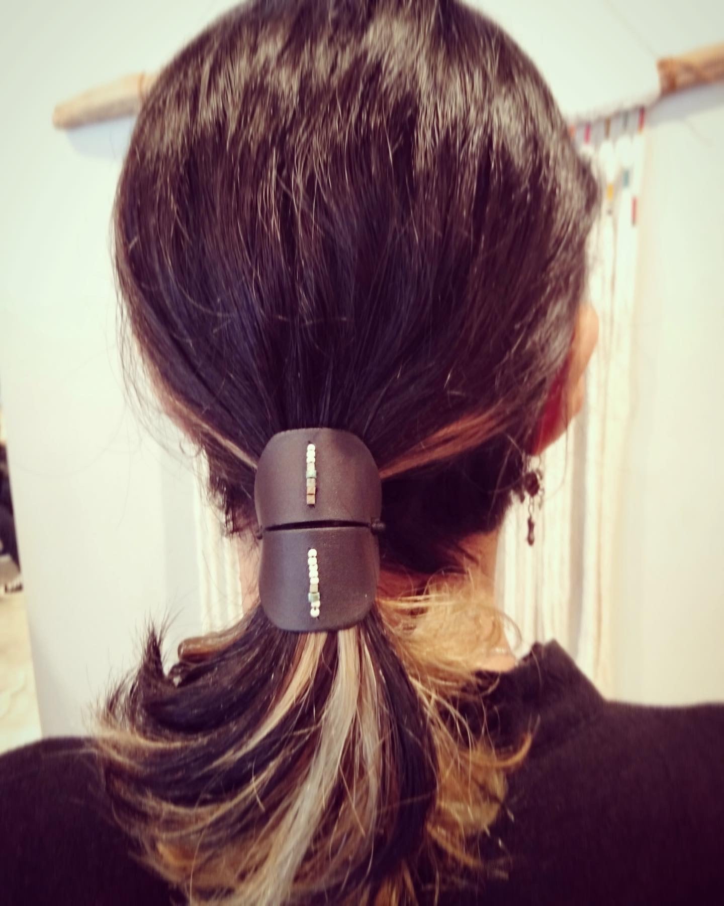 本革にひとつひとつカラフルな刺繍とビーズをデザインしたヘアゴムになります